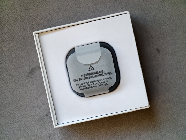 打开外层包装,内盒中的充电盒令人眼前一亮。近似圆角矩形的设计,哑光黑色的外壳触感细腻,正面下方的白色指示灯简约而不失科技感。充电盒上盖贴有银灰色标签,温馨提示用户“为获得最佳佩戴体验,请不要过度弯折或拉伸耳机C形桥”,这一细节足见华为对产品耐用性和用户体验的双重考量。