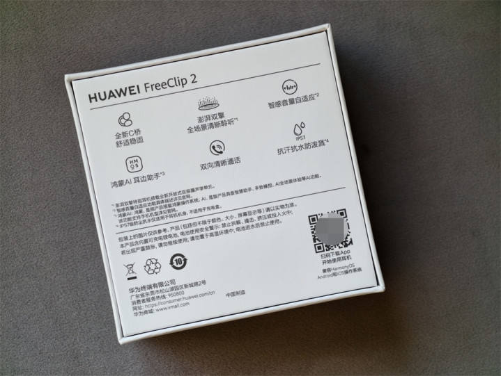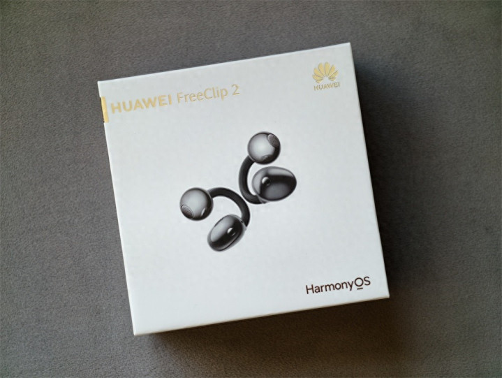 当我第一次拿到HUAWEI FreeClip 2时,纯白方正的盒体上金色的“HUAWEI FreeClip 2”字样与标志性的花瓣logo相得益彰,右下角的“HarmonyOS”标识预示着这款产品与华为生态系统的无缝连接。整体包装简洁却不失高端,令人对盒内产品充满期待。