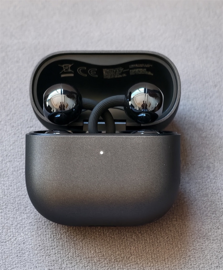 掀开充电盒盖,一对耳夹耳机安静地嵌在盒内。耳机外观圆润,表面具有金属光泽,能够反射周围光线,呈现出精致时尚的质感。